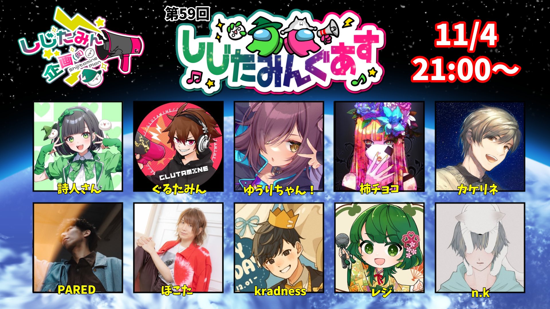 2025.11.04(火)21:00 しじたみん企画(仮)presents『しじたみんぐあす』第59回 streaming 2025.11.04 2025/11/04(火)21:00 しじたみん企画(仮)presents『しじたみんぐあす』第59回 しじたみん企画(仮)プレゼンツ詩人さん主催Among Us企画第59回『しじたみんぐあす』 🍜💚配信のお知らせ📢⚡️明日 21:00〜 ‼️しじたみん企画(仮)プレゼンツ詩人さん主催Among Us企画第59回‼️『しじたみんぐあす』今回は画像の豪華メンバーで盛り上がっちゃうぞ‼️※各視点配信一部あり#しじたみんぐあす pic.twitter.com/q4BUaGoi1F— しじたみん企画(仮)【11/8(土)確フェス開催!!】 (@shijitamine) November 3, 2025