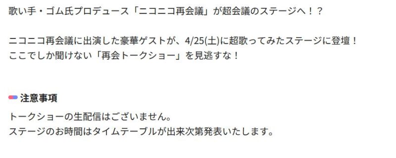 2026.04.25(土)ニコニコ再会議再会トークショー@ニコニコ超会議 超歌ってみた/幕張メッセ event 2026.04.25 2026/04/25(土)ニコニコ再会議再会トークショー@ニコニコ超会議 超歌ってみた/幕張メッセ 出演者 超歌ってみた | ニコニコ超会議2026 公式サイト画面の前で口ずさんでいたあの曲を、幕張メッセで歌おう!弾幕を浴びる準備は出来てるか! ||◤#超歌ってみた 開催決定🎤◢||今年も抽選制で歌えるステージ開催✨"超ウルトラフィーバータイム!!もあります🎤💚ニコニコ再会議再会トークショー💚歌ってみた Collection LIVE ~2026 Spring~など様々な企画も実施予定🥳🔽詳細はこちらhttps://t.co/v4NGZtpvAJ#ニコニコ超会議2026 pic.twitter.com/ooixJ2B5Jj— ニコニコ超会議2026@4/25(土)・26(日)幕張メッセで開催決定‼ (@chokaigi_PR) February 19, 2026