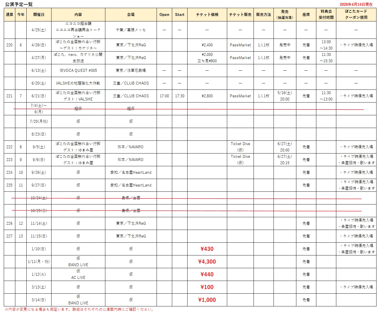 | 220 | 6 | 2026/04/26(日) | ぽこたの全国触れ合い行脚[ゲスト:カケリネ]/下北沢ReG |